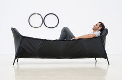 The sofa symmetric design can be used by one or two people, its bath shape suggesting that reclining posture would be the best way to use it. The design is based on a minimal metal frame, woven rubber straps and it is upholstered with leather.